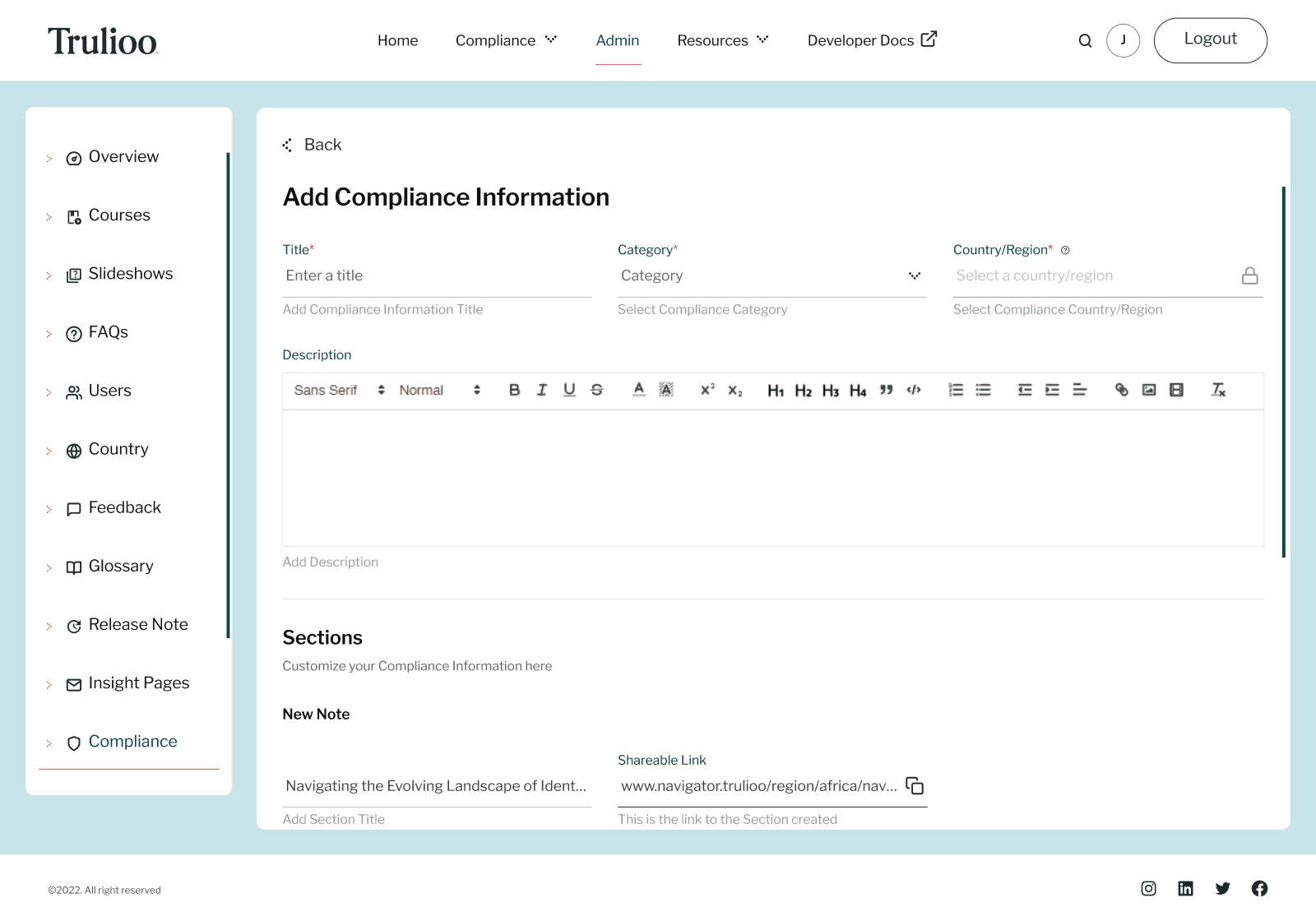 I translated the conceptual framework into a clean, user-friendly interface. The compliance pages were designed for clarity and ease of use, while the admin portal empowers Trulioo’s team to efficiently manage compliance data.